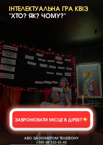 Запрошуємо вас провести суботній вечір весело, смачно й з користю для мозку! На вас чекає захоплива гра, крута атмосфера та подарунки переможцям.