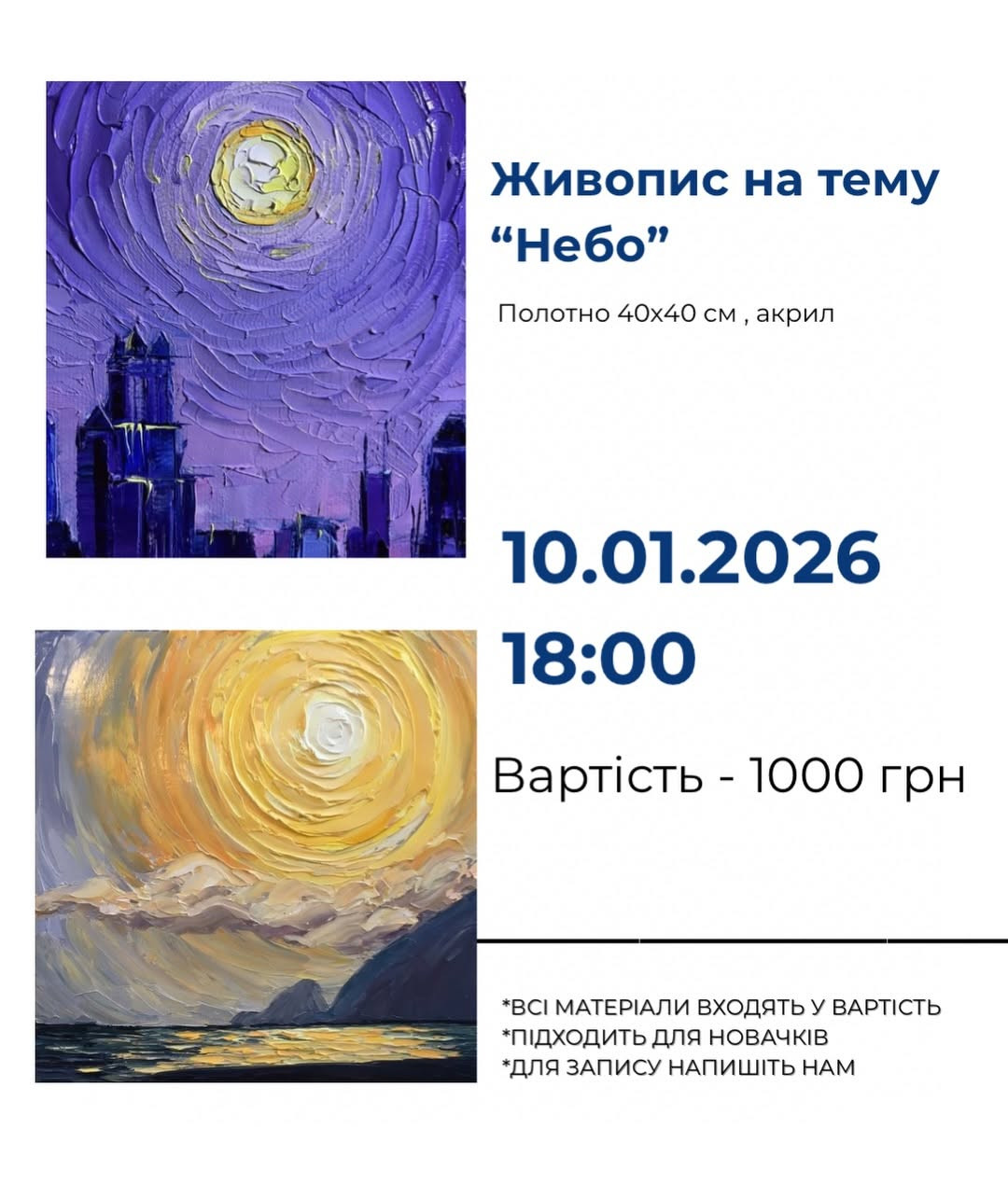 Запрошуємо на майстер-клас з живопису на тему "Небо" — подію, де мистецтво зустрічається з безмежністю. Це можливість зупинитись, підняти погляд угору й перенести на полотно усе те, що хвилює, надихає й зачаровує. У затишній атмосфері ми разом створимо роботи, сповнені легкості, глибини й емоцій. Усе необхідне — на місці, все найцінніше — у тобі. Дозволь собі політ фантазії!