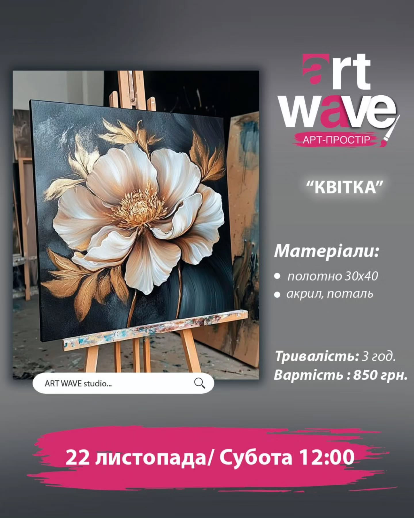 Під час заняття ви створите картину на полотні з використанням акрилових фарб і поталі, додаючи сяйва та глибини своїй роботі. У центрі композиції — квітка, символ краси, ніжності й натхнення.