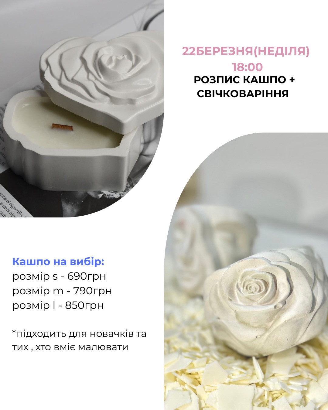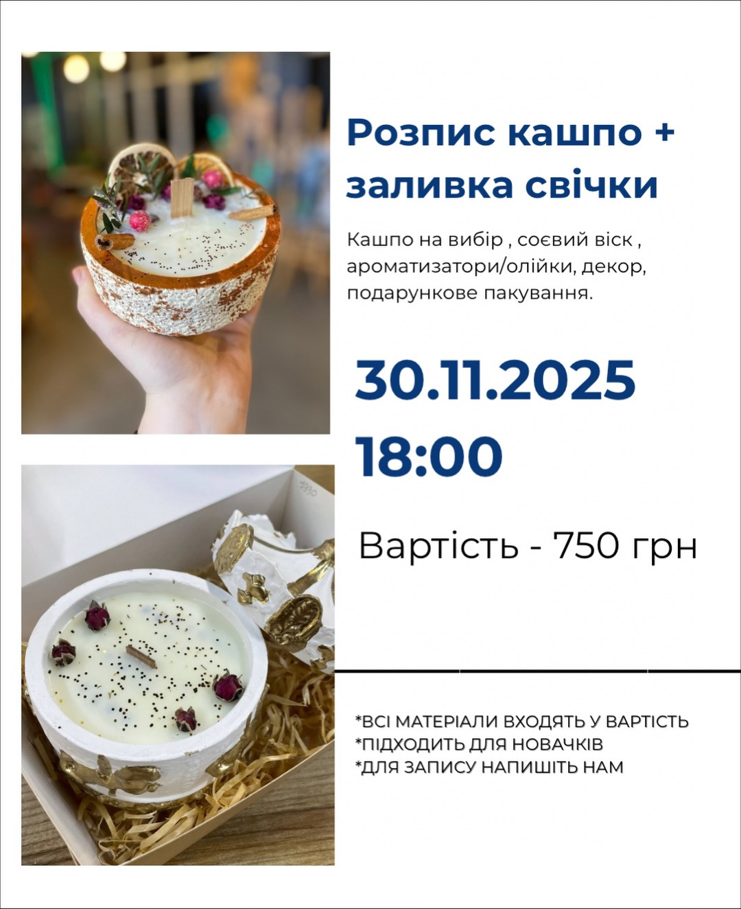 Учасники створять стильний декор власноруч — розпишуть кашпо в улюблених кольорах і заллють ароматну свічку, що стане чудовим доповненням інтер'єру або теплим подарунком.