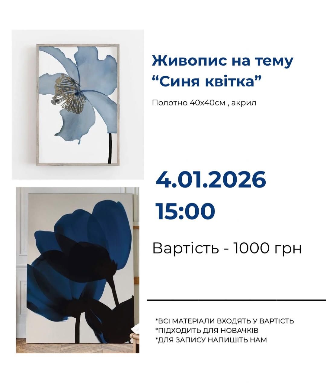 Запрошуємо на майстер-клас з живопису на тему "Синя квітка" — витончену творчу подію, сповнену символіки, глибини та натхнення. Разом ми зануримося у світ кольору й настрою, де синя квітка постає як образ мрії, спокою та внутрішньої свободи. Під час майстер-класу ви створите власну картину, відкриєте нові грані творчості та насолодитеся атмосферою гармонії й натхнення.