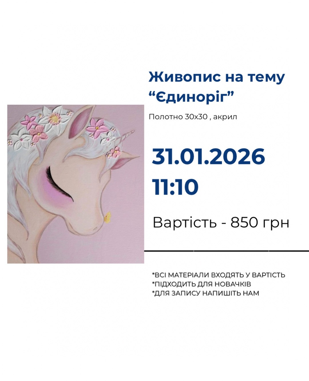Запрошуємо на майстер-клас з живопису для дітей "Єдиноріг" — чарівну творчу пригоду у світі фантазії та кольорів.