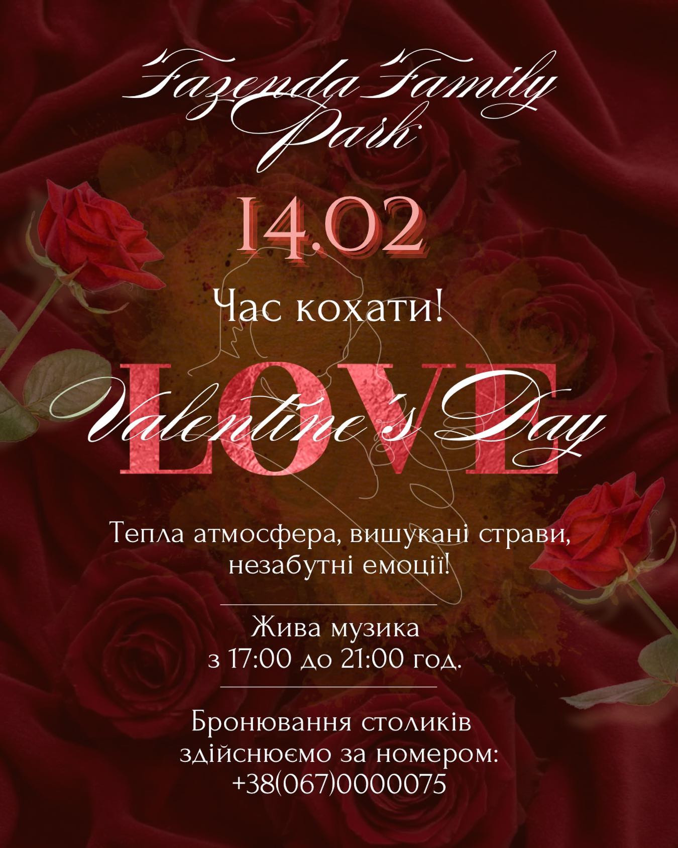 Fazenda Family Park запрошує відсвяткувати найромантичніше свято в затишній атмосфері нашого закладу під звучання живої музики із коханою людиною — за келихом вина у приємній атмосфері нашого закладу!