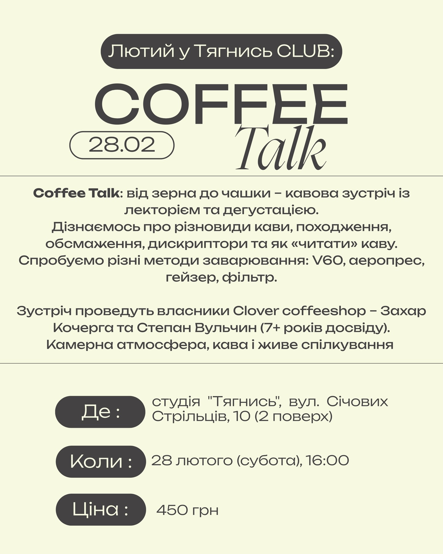 Запрошуємо на кавову зустріч "Coffee Talk: від зерна до чашки" — лекторій та майстер-клас для всіх, хто любить каву і хоче знати про неї трішки більше.