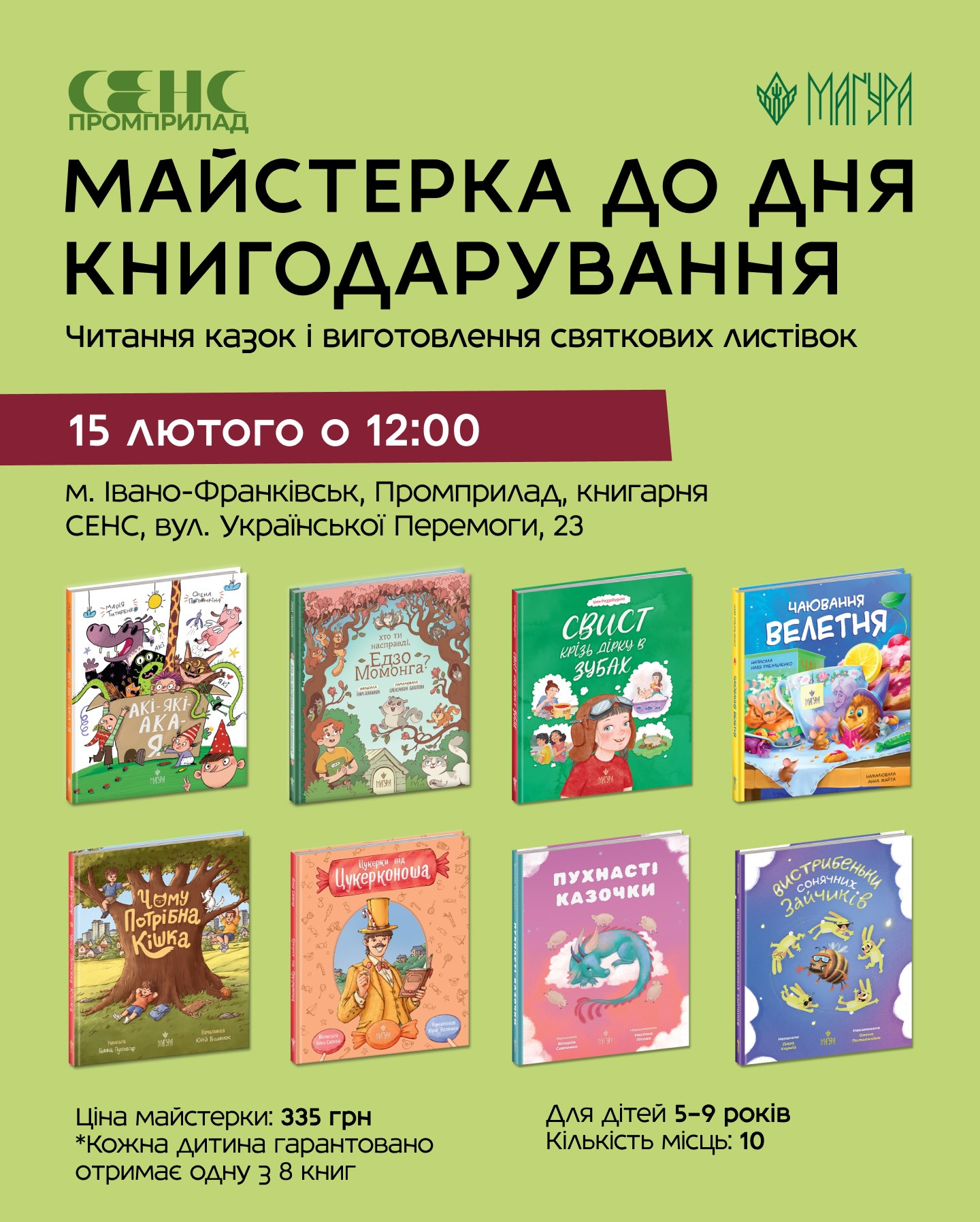 У квиток входить книжка на вибір з нашої дитячої колекції та листівка, яку дитина приготує під час майстерки.