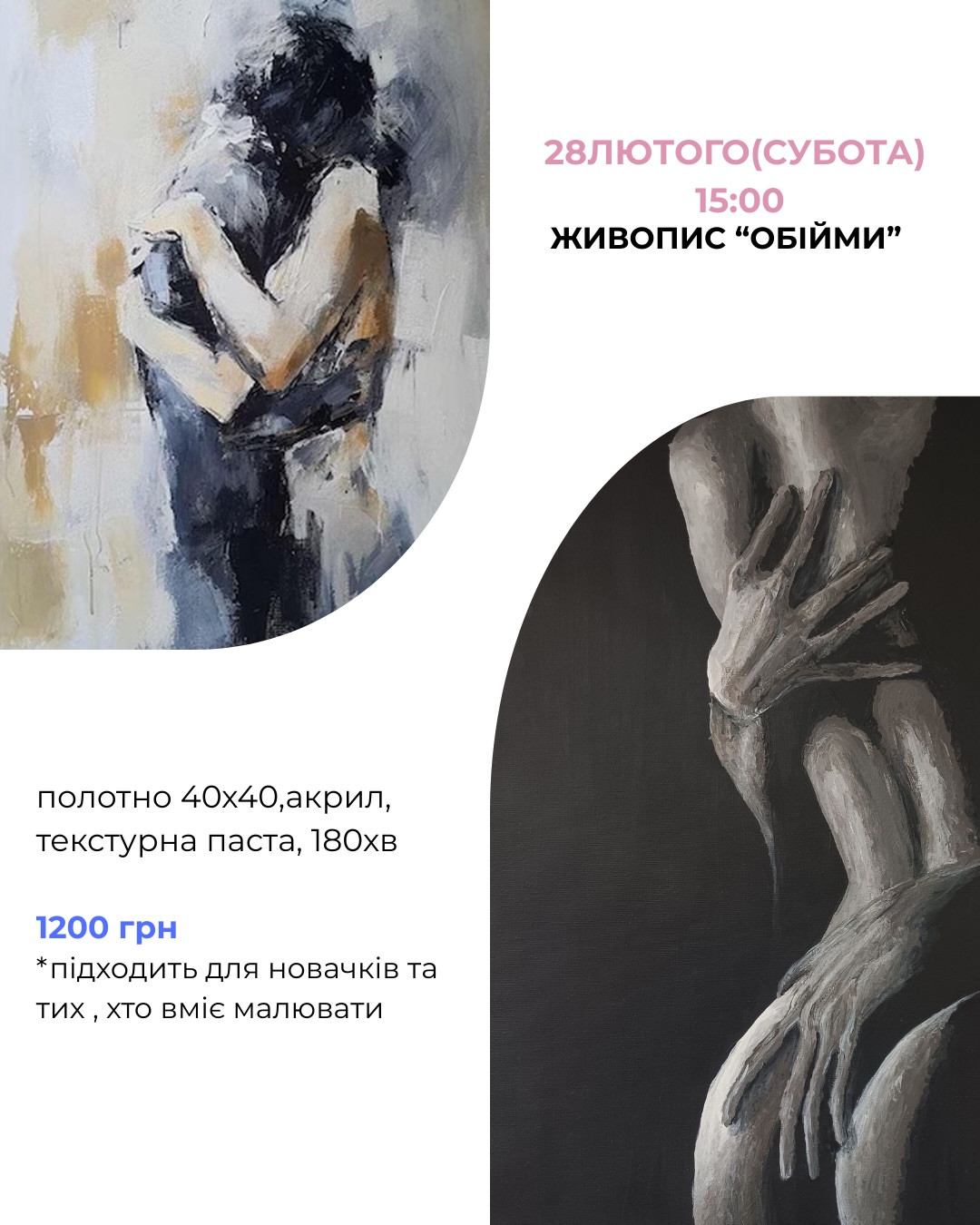 Запрошуємо на майстер-клас з живопису "Обійми" — теплий творчий вечір, присвячений найщирішим почуттям.