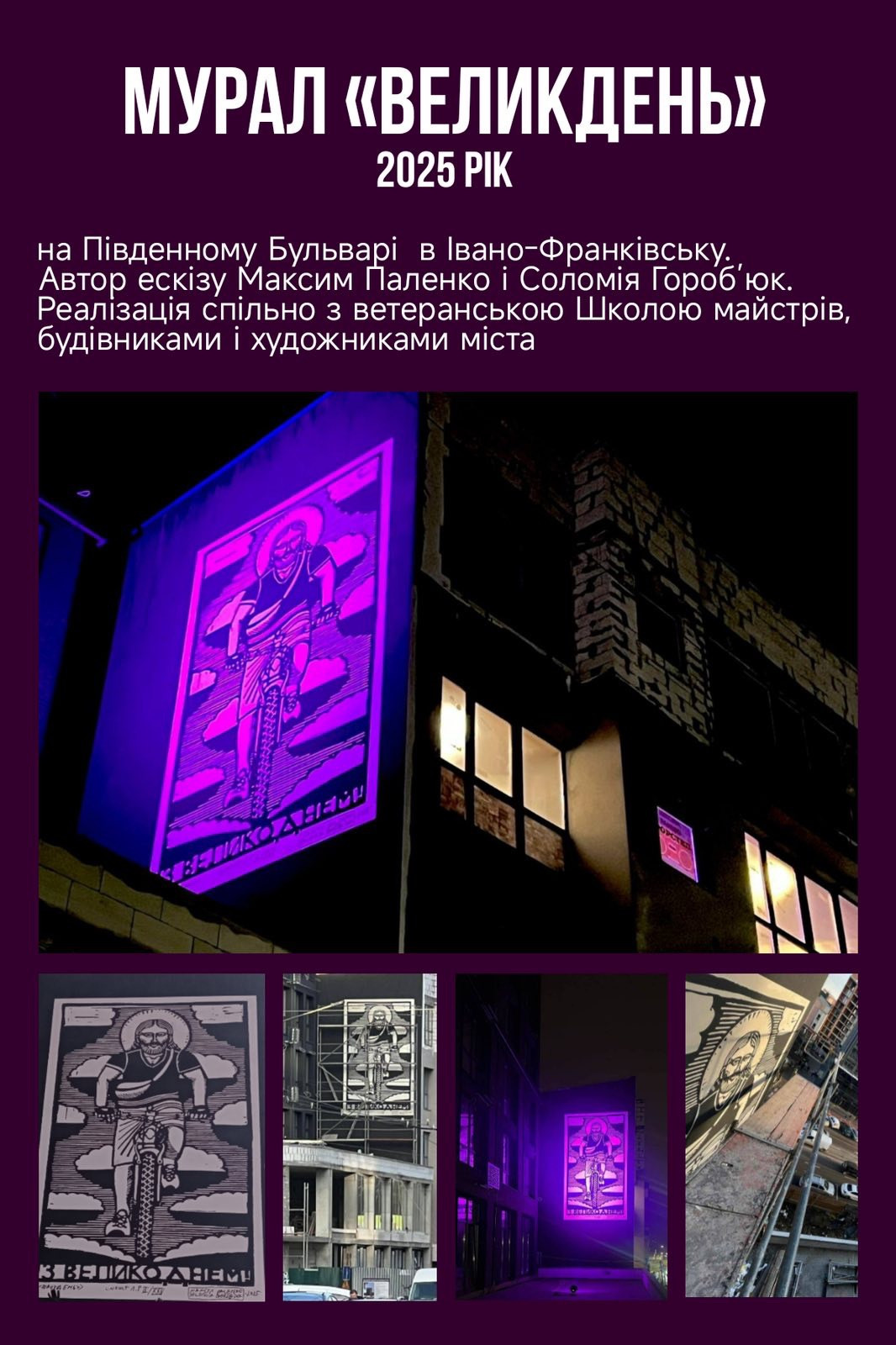 Але в той день ми також презентували 20 християнських муралів у Франківську. То з того часу добавилось ще 5. Це не враховуючи муралів про Героїв, бо то таки новітні святі, просто потрібно, шоб ми акцентували на тому напевно. То ж з наступного тижня в Краєзнавчому музеї в "Херсонській каплиці" там де Сакральне Сучасне, будуть виставлені ці постери з новими роботами.