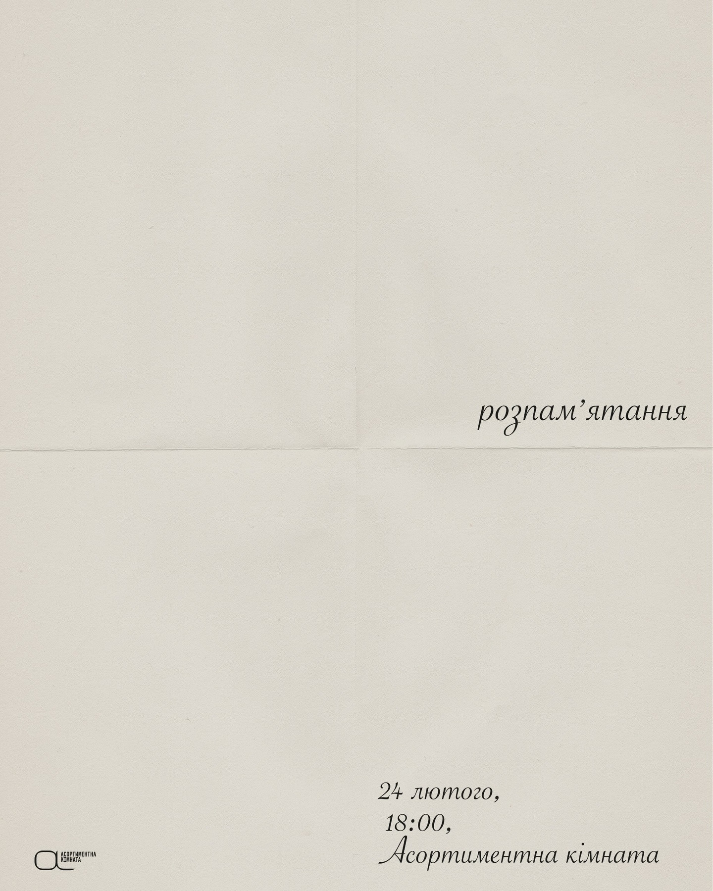 Цього дня запрошуємо на "розпам'ятання". Пропонуємо в цей вечір зафіксувати спогади у формі текстового, візуального, звукового чи іншого щодненникового запису — для багатьох не нова форма. Що з цим записом робити далі, ваше рішення. Ми ж підготуємо все для опцій нашого формату, щоб в той самий вечір експонувати щоденники в одній з кімнат Асортиментної або ж знищити — спалити, розрізати, розмалювати, you name it — та потім експонувати залишки.
