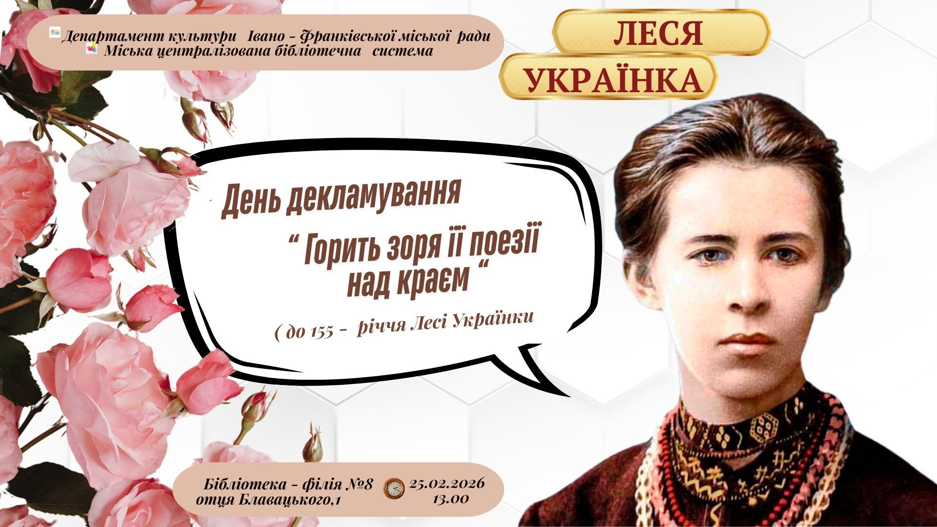Запрошуємо відзначити ювілей видатної поетеси Лесі Українки через живе слово та літературну пам'ять.