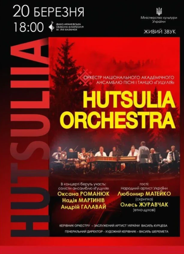 На глядачів чекають найвідоміші карпатські інструментальні композиції, неповторні соло, несподівані музичні рішення та улюблені мелодії, що відгукуються в серці. Hutsulia Orchestra подарує вам неймовірну музичну подорож до глибин Карпат!