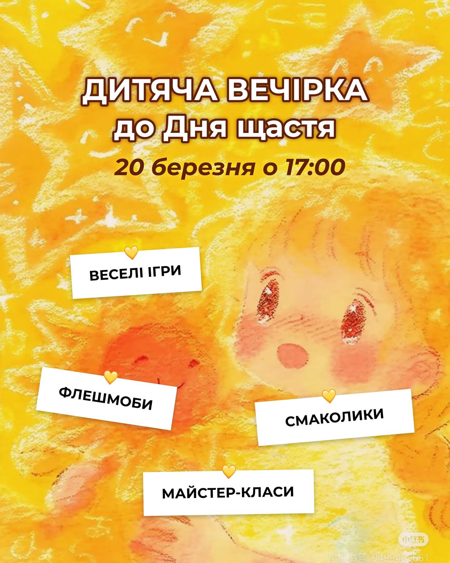 Запрошуємо дітей 5–9 років на веселу святкову вечірку з нагоди Дня щастя.