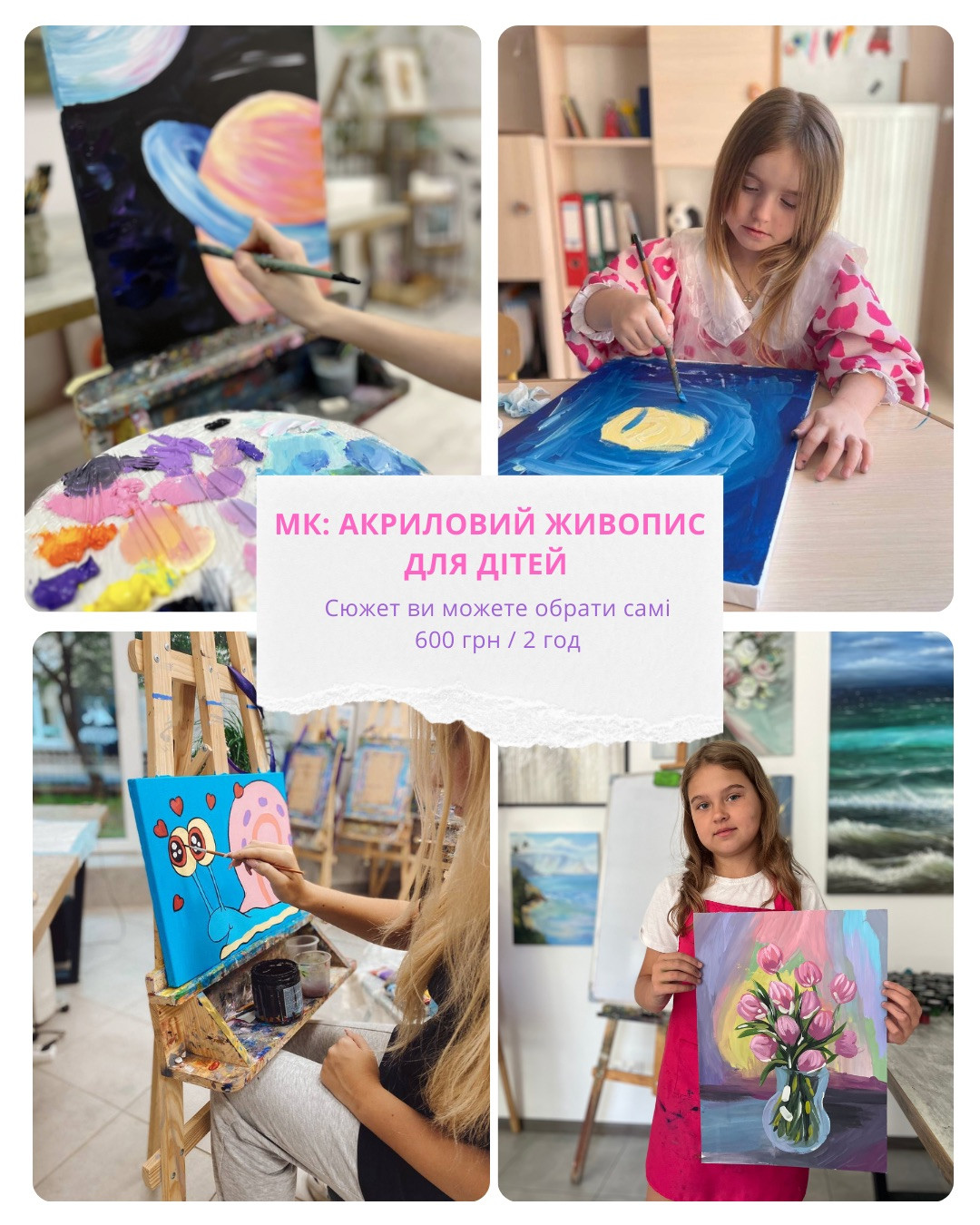 На занятті кожен учасник зможе самостійно обрати сюжет для своєї картини та втілити його за допомогою акрилових фарб. Діти познайомляться з технікою роботи з акрилом, навчаться змішувати кольори та створювати власні художні історії.