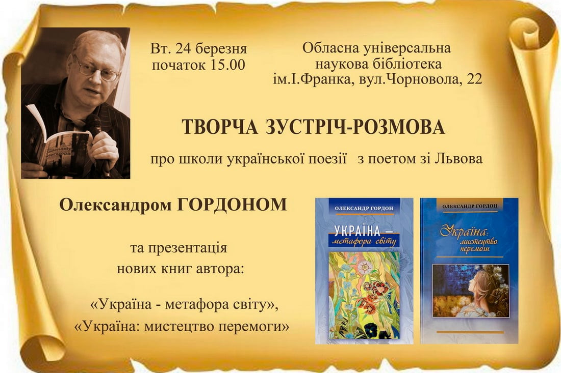 Запрошуємо на творчу зустріч-розмову з поетом Олександром Гордоном.