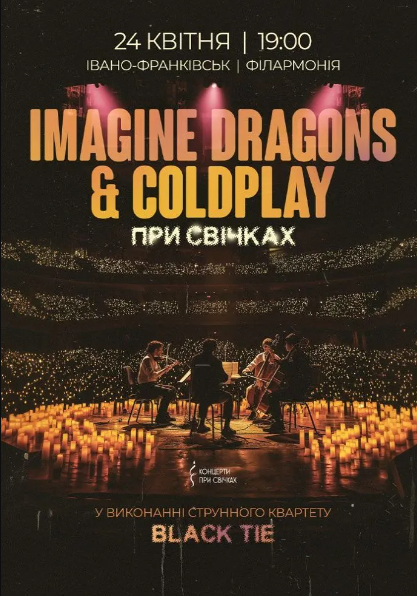 Запрошуємо на особливу музичну подію – концерт "IMAGINE DRAGONS & COLDPLAY при свічках". Приготуйтеся насолоджуватися ліричною адаптацією всесвітньо відомих хітів від струнного квартету "Black Tie" у затишній атмосфері з теплим світлом сотень свічок. Це буде неперевершено!