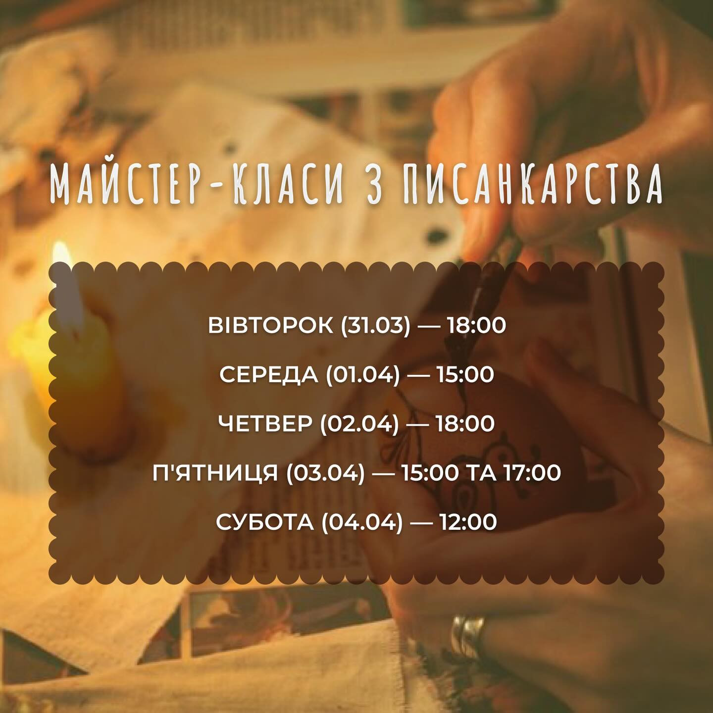 Запрошуємо на майстер-класи з писанкарства! Створіть власну унікальну писанку та відчуйте атмосферу традицій разом із нами.