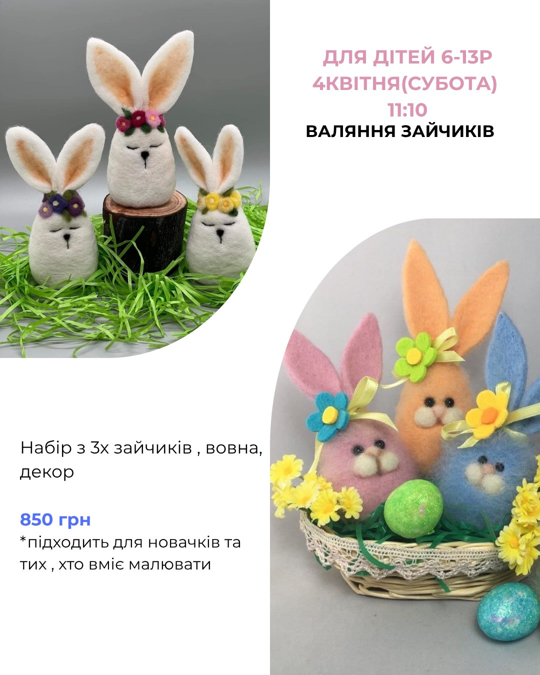 Запрошуємо на дитячий майстер-клас "Валяння зайчиків" — теплу та творчу пригоду, де народжуються милі пухнасті друзі.