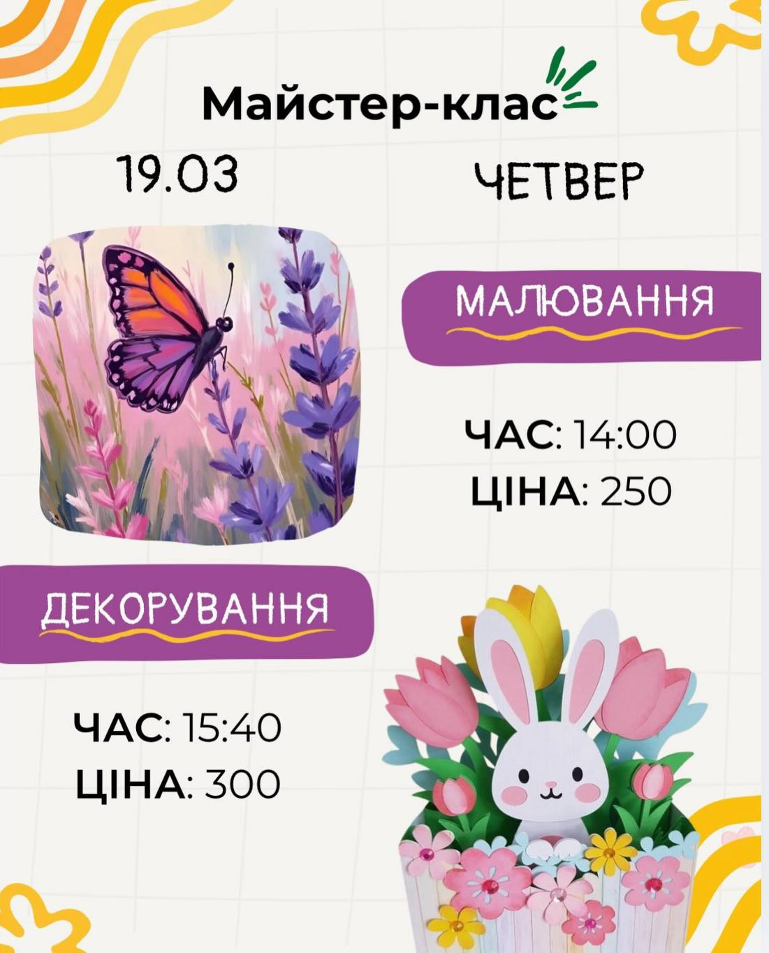 Майстер-класи відбудуться о 14:00 та 15:40 год