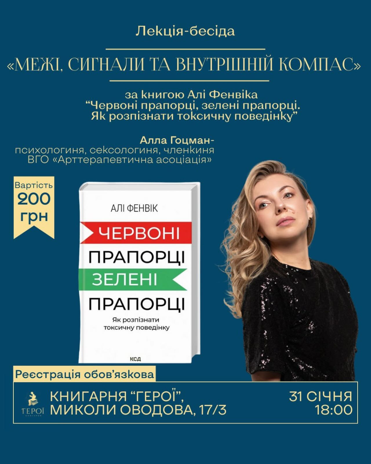 Любі, а ходіть послухати лекцію-бесіду довкола книги Алі Фенвіка "Червоні прапорці, зелені прапорці: як розпізнати токсичну поведінку"! Говоритимемо про надважливе.