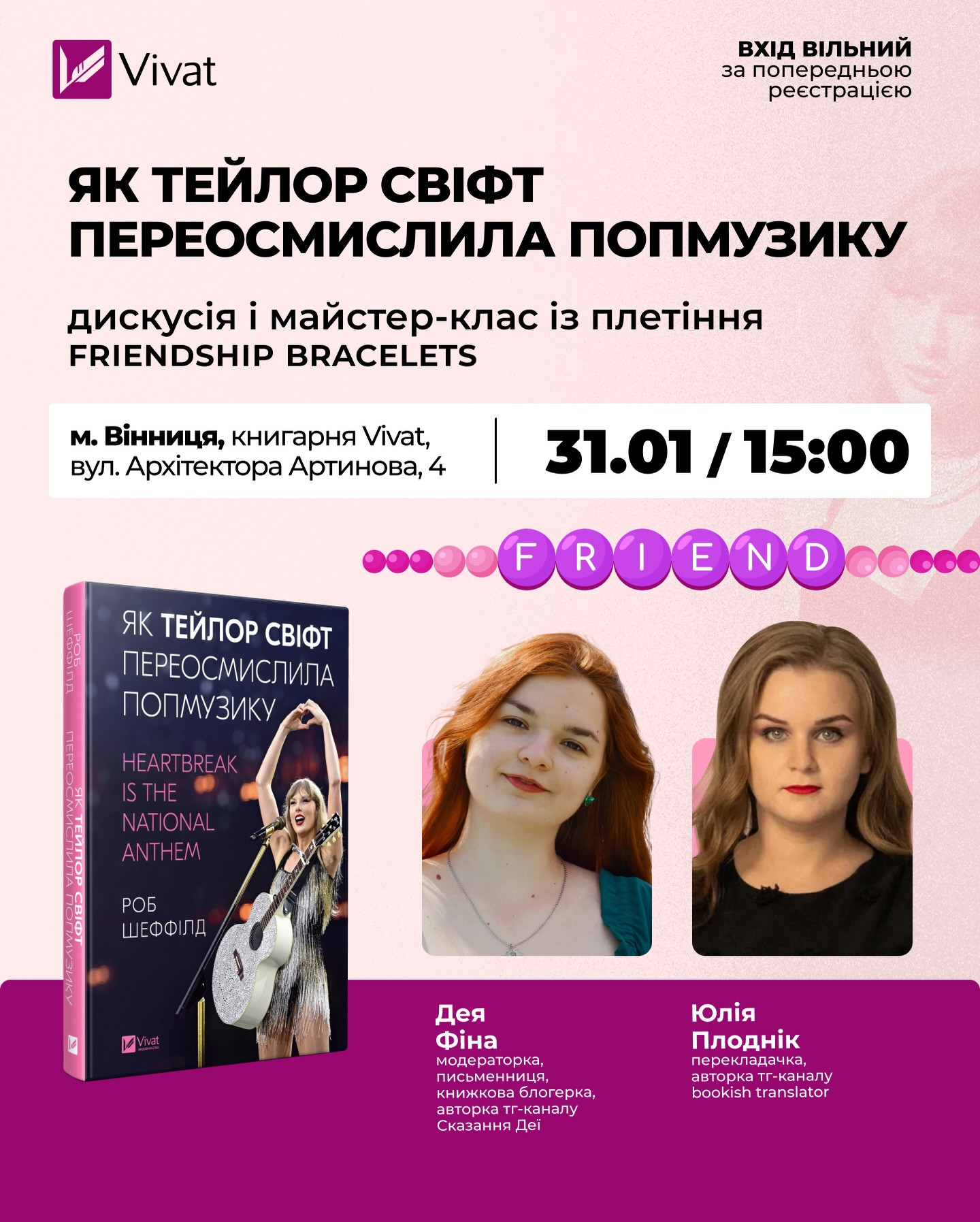 Після розмовної частини на гостей чекатиме невеличкий бонус — камерний майстер-клас із плетіння friendship bracelets, як символ фан-культури Тейлор Свіфт.