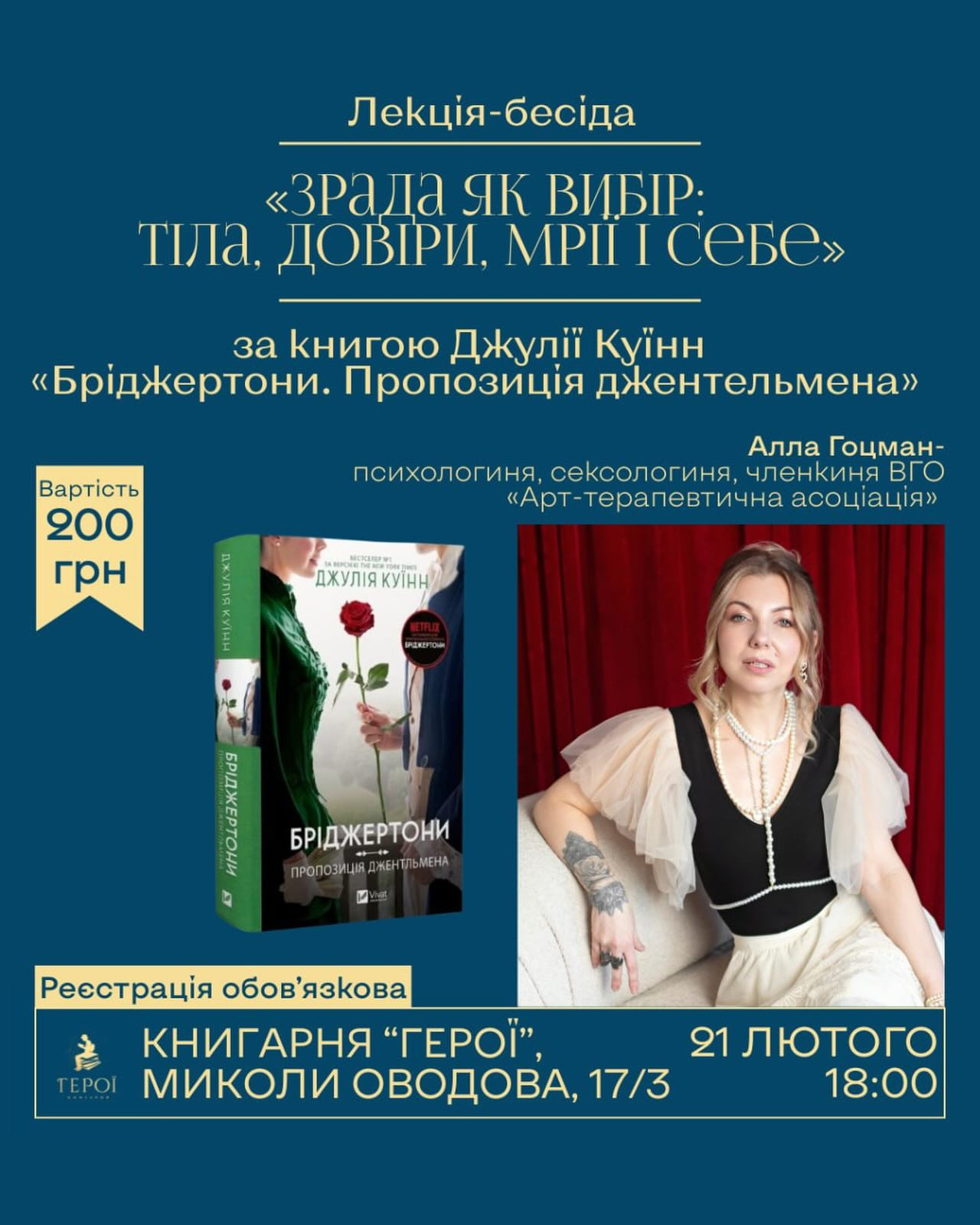 Наша зустріч "Зрада як вибір: тіла, довіри, мрії і себе" відбудеться на основі роману Джулії Куїнн "Бріджертони. Пропозиція джентльмена"— історії, де любов і репутація танцюють небезпечний вальс.