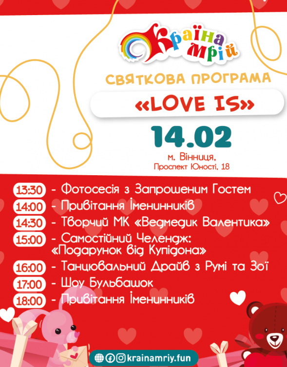 14 лютого Країна Мрій запрошує дітей та їхні родини на яскраву святкову програму до Дня святого Валентина "Love is…".