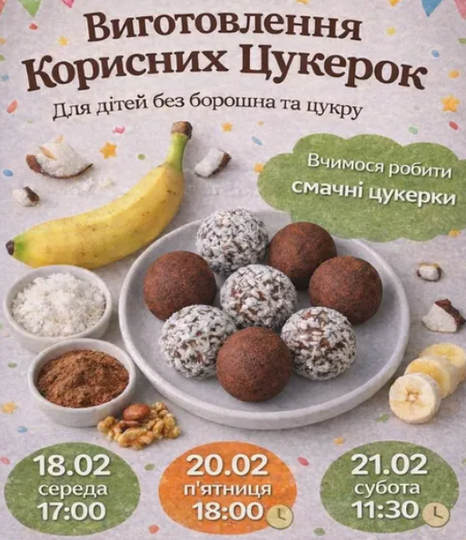 Діти власноруч створять солодощі, дізнаються про корисні інгредієнти та заберуть результат додому.