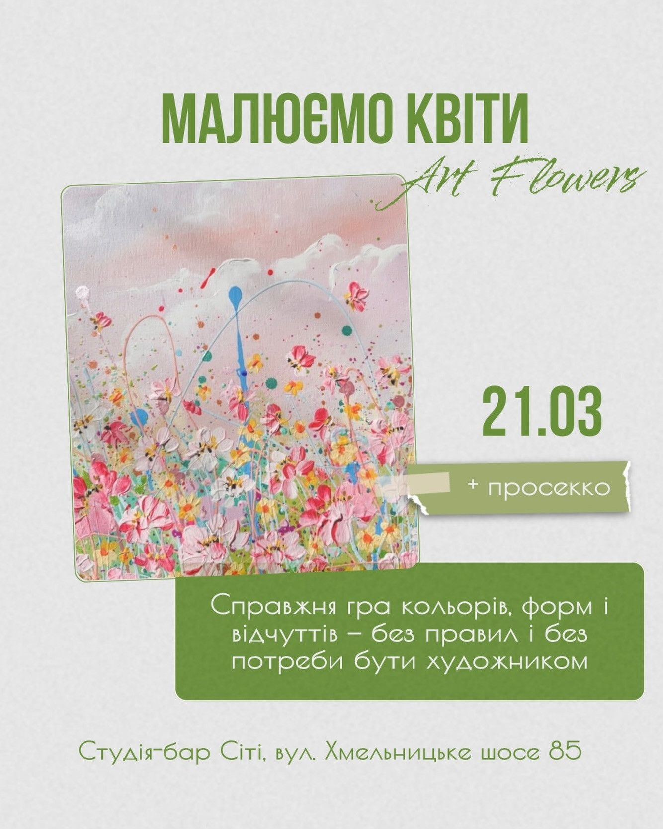 Запрошую на творчій арт-івент. Разом ми поринемо у світ квіткових форм, навчимось передавати їхню красу фарбами та створимо власну унікальну картину.