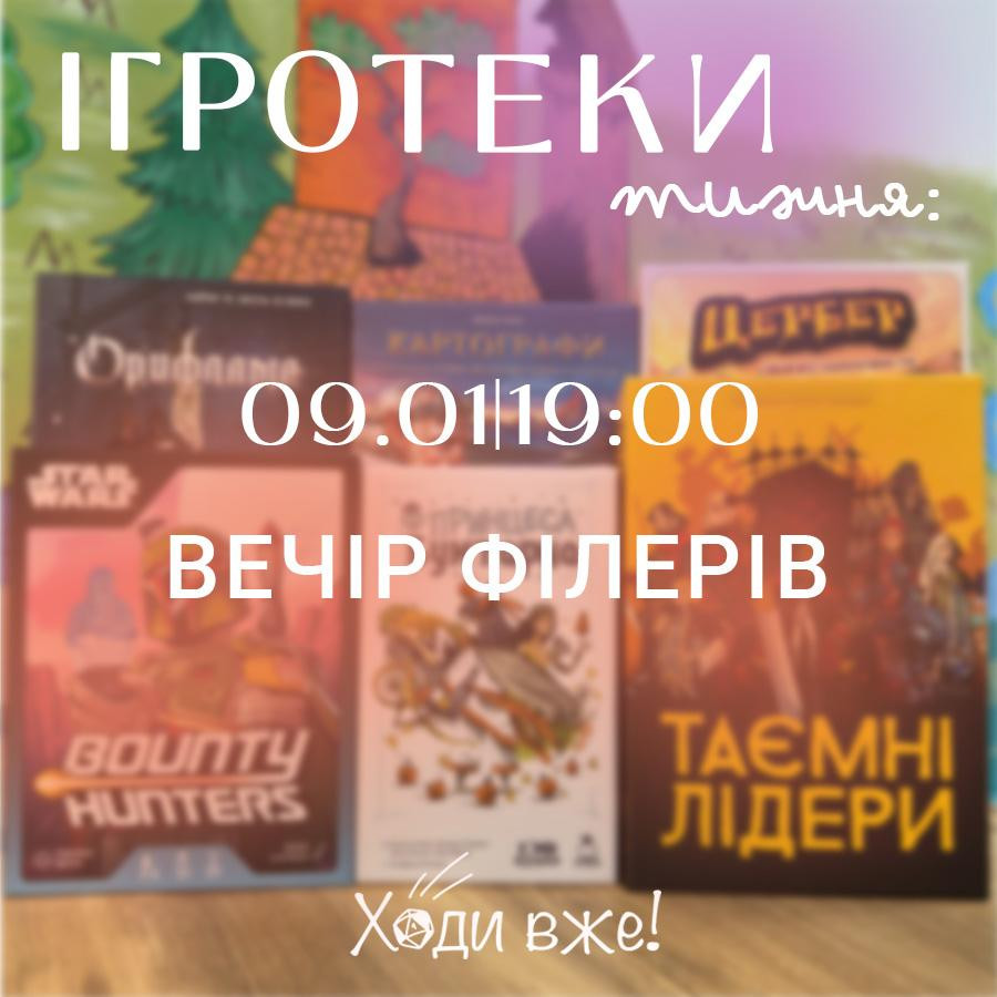 - Вечір Філерів. Веселі карткові ігри з простими правилами та швидкими партіями. Мінімум підготовки, максимум взаємодії й формат, у який легко влитися будь кому — ідеально для будь якої компанії та невимушеного вечора.