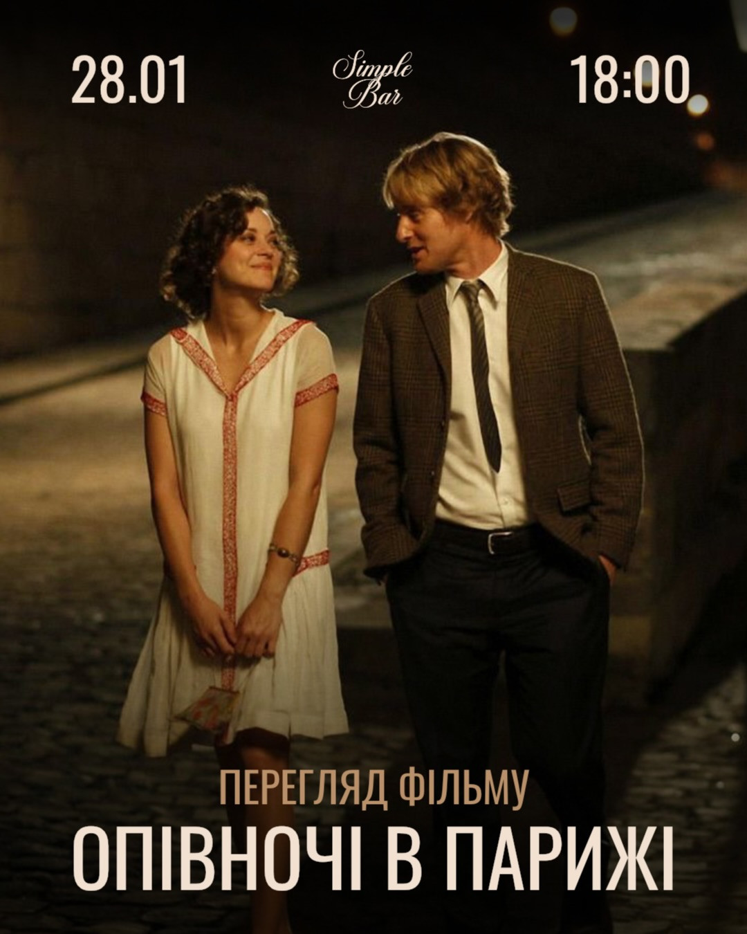 Цієї середи запрошуємо вас на атмосферний перегляд фільму "Опівночі в Парижі" - історію про кохання, мистецтво й магію вечорів.