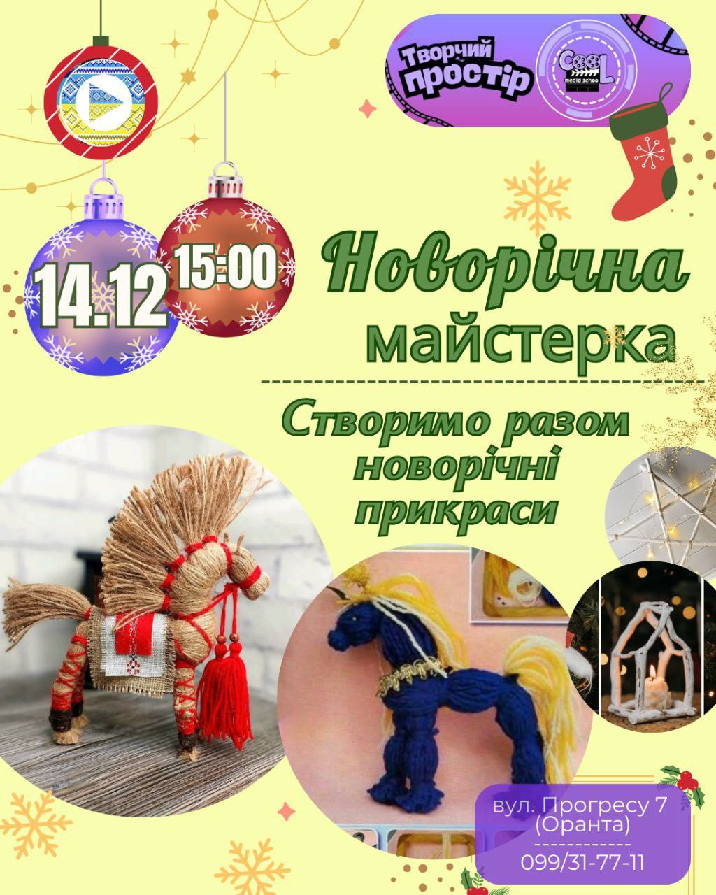 Творчий простір "COOL Media School" та громадська організація "Старт у Нове Життя" запрошують! Майстер-клас з виготовлення символу наступного року - коника та новорічних прикрас.