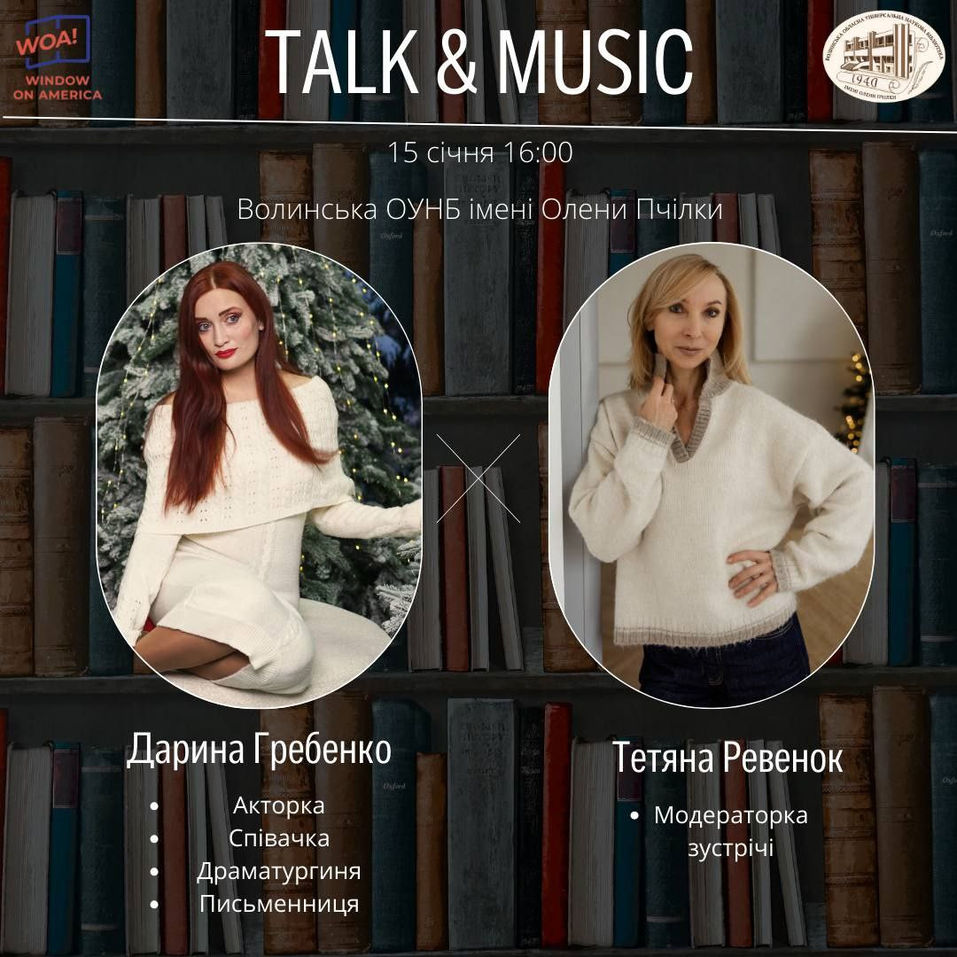 Запрошуємо на камерну зустріч у форматі TALK&MUSIC із Дариною Гребенко - акторкою Волинського академічного музично-драматичного театру, драматургинею, письменницею, авторкою пісень і вокалісткою гурту Nervo3ni.