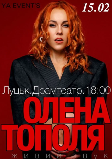 15 лютого на сцені Драмтеатру в Луцьку відбудеться перший великий сольний концерт Олени Тополі - співачки з потужною енергетикою, проникливим голосом і особливою музичною чутливістю.