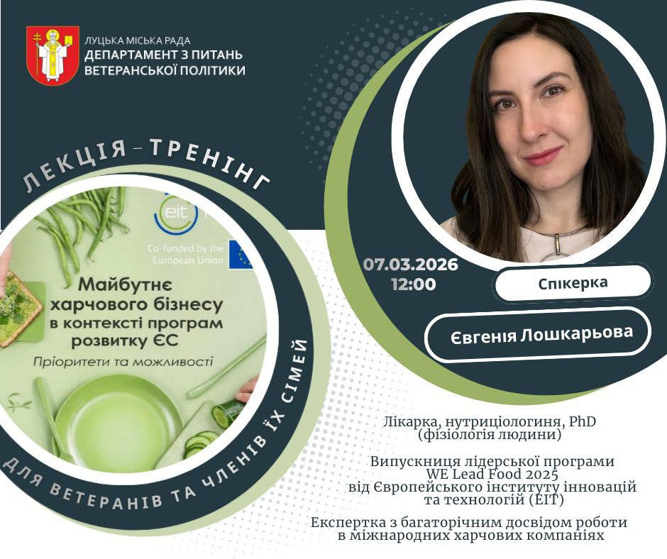 Запрошуємо ветеранів / ветеранок та членів їхніх сімей відвідати лекцію-тренінг на тему "Майбутнє харчового бізнесу в контексті програм розвитку ЄС: пріоритети та можливості".
