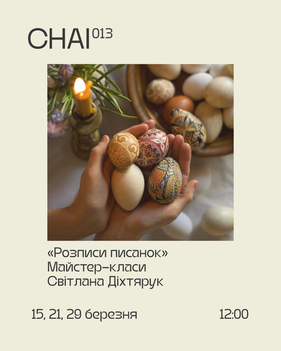 Це особливий досвід — спостерігати, як лінії воску лягають на поверхню писанки, як народжується орнамент і поступово оживає малюнок. Допомагати вам буде Світлана Діхтярук — художниця та фотографка.