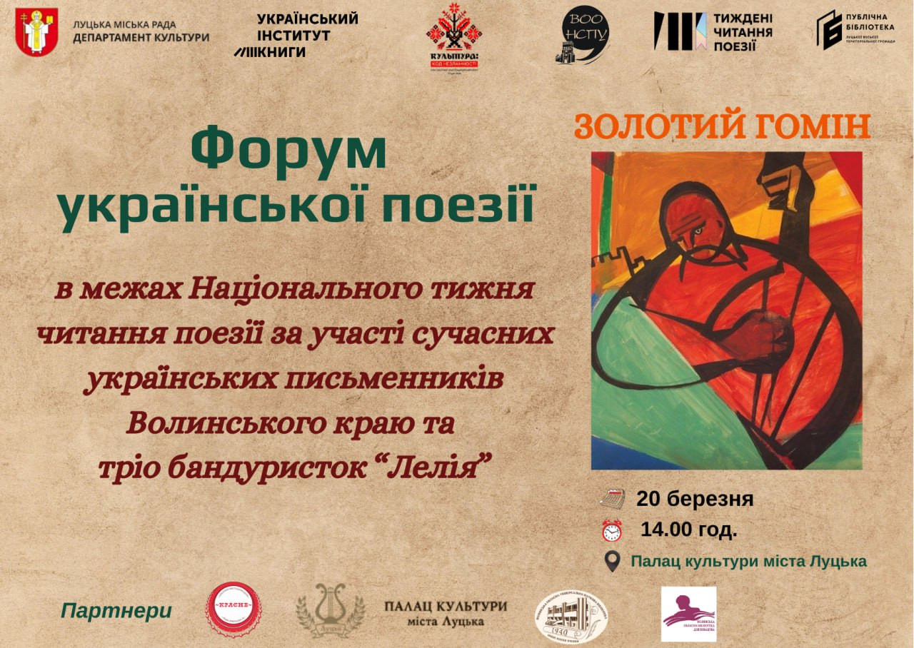 Захід відбудеться у межах Національного тижня читання поезії "Золотий гомін" та благодійного мистецького марафону "КУЛЬТУРА: КОД НЕЗЛАМНОСТІ", що реалізовується департаментом культури Луцької міської ради та закладами культури громади.