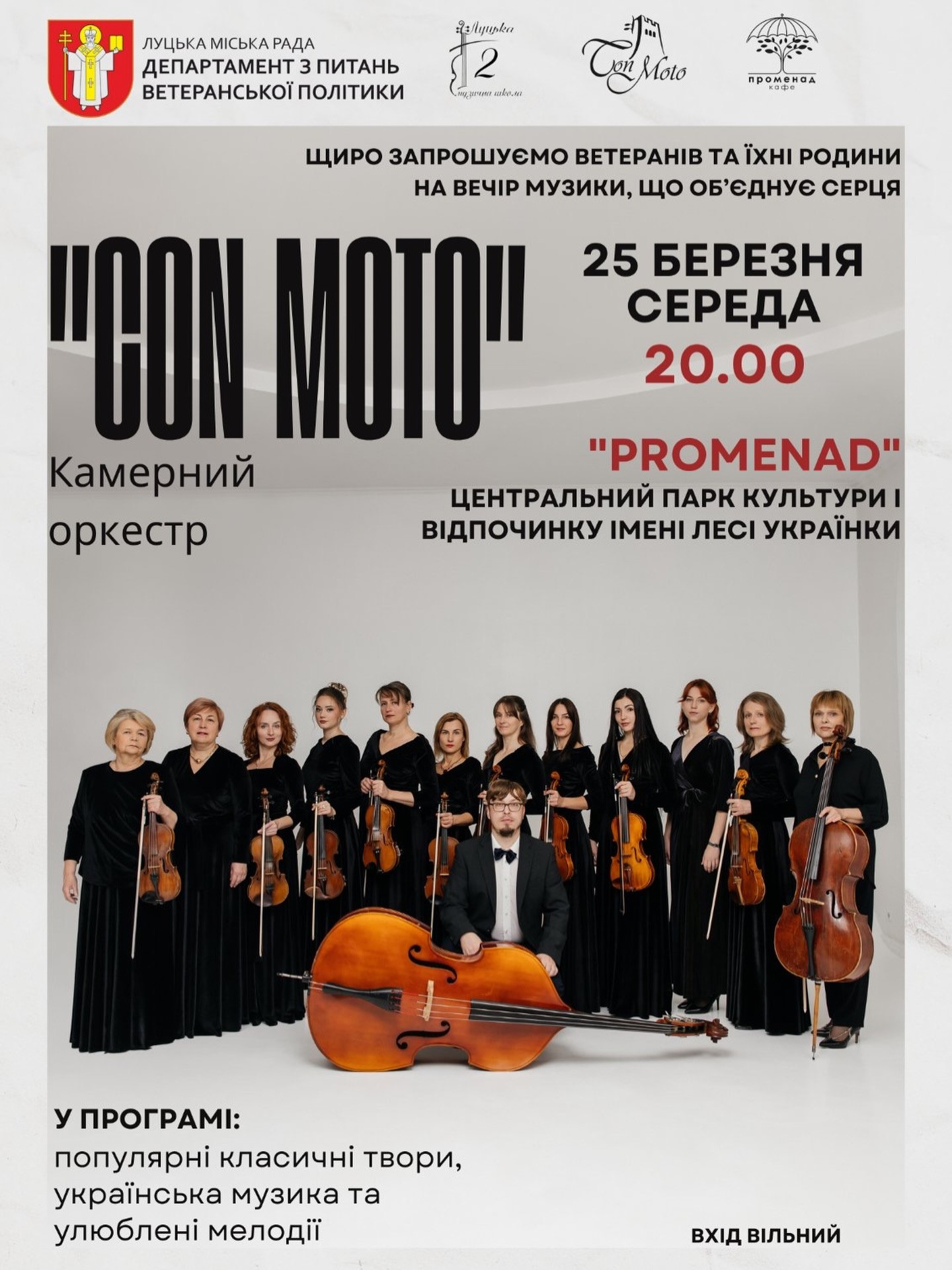 Запрошуємо ветеранів / ветеранок та їхні родини на вечір музики, що об’єднує серця - виступ камерного оркестру "Con Moto".