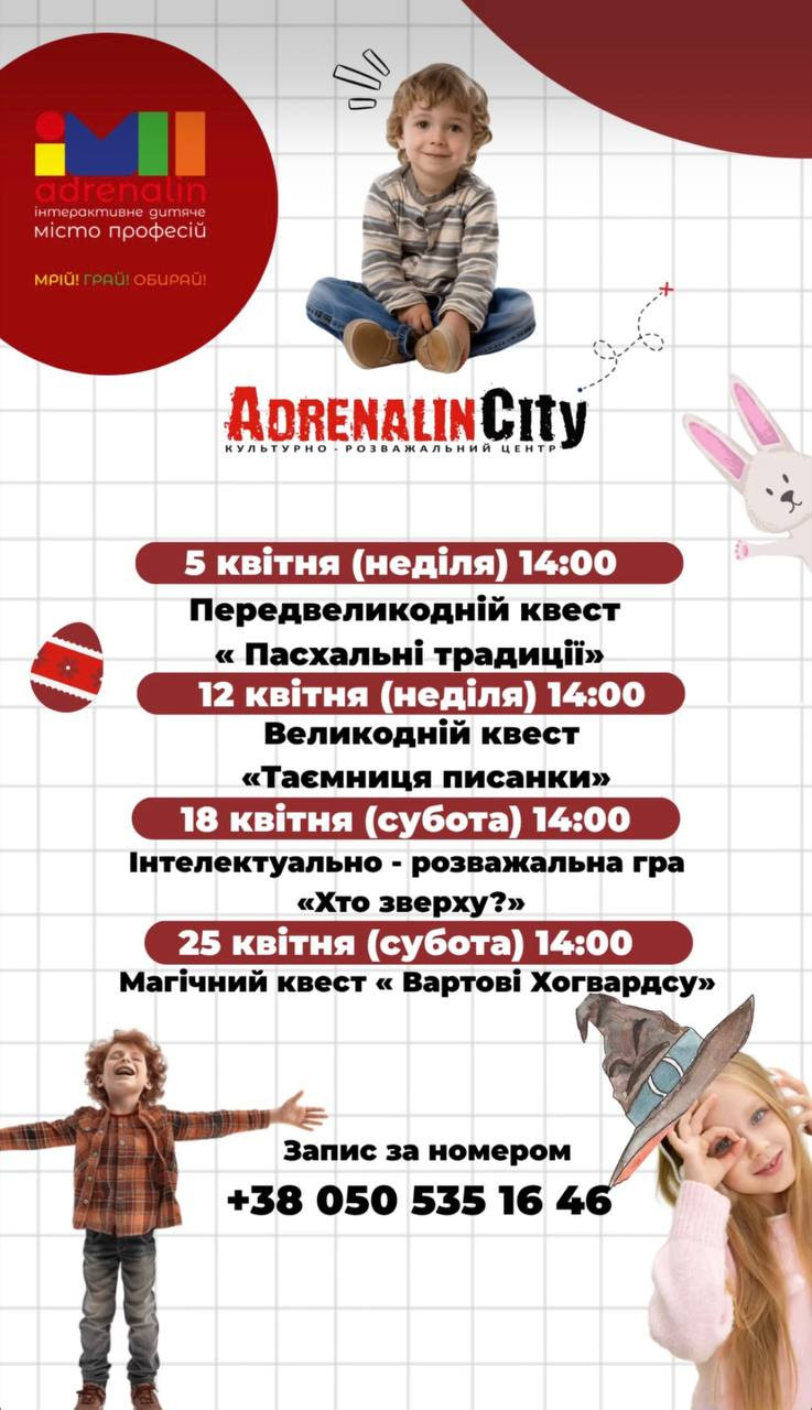 Весняні пригоди. У культурно-розважальному центрі Adrenalin City підготували серію яскравих подій для дітей — із пригодами, іграми та святковим настроєм.