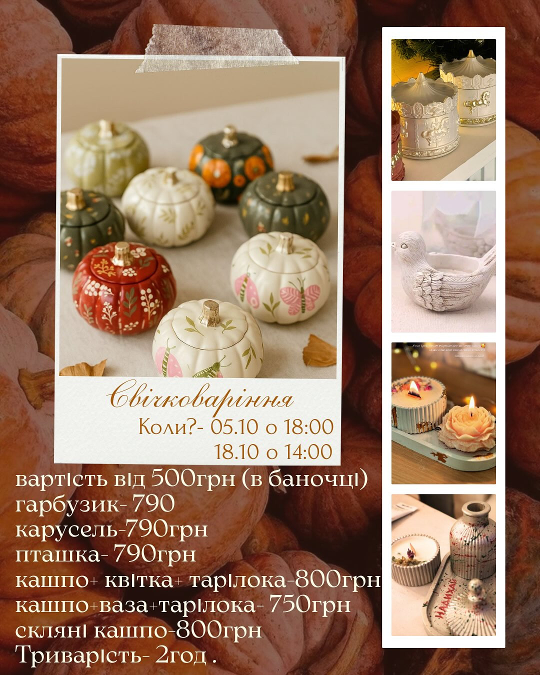 Маємо великий асортимент ароматів, працюємо лише з натуральними восками, також є багато варіантів самих кашпо, прикрашаємо сухоцвітами та різним декором.