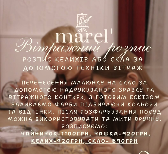 Перенесення малюнку на посуд за допомогою надрукованого зразку та вітражного контуру, з готовим ескізом заливаємо фарби підбираючи кольори та відтінки, після розфарбування посуд можна використовувати та мити вручну. Розписуємо на вибір: чайничок, чашку, келих або скло.