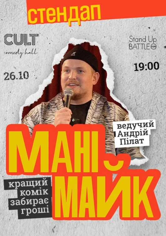 Манімайк – це не просто вечір стендапу, а можливість відпочити, посміятися від душі та приємно провести вечір. Вас чекають гострі жарти, комічні історії з життя та найкращий матеріал наших коміків, адже кожен з них прагне перемогти та отримати приз.
