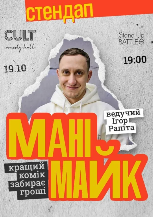 Манімайк – це не просто вечір стендапу, а можливість відпочити, посміятися від душі та приємно провести вечір. Вас чекають гострі жарти, комічні історії з життя та найкращий матеріал наших коміків, адже кожен з них прагне перемогти та отримати приз.
