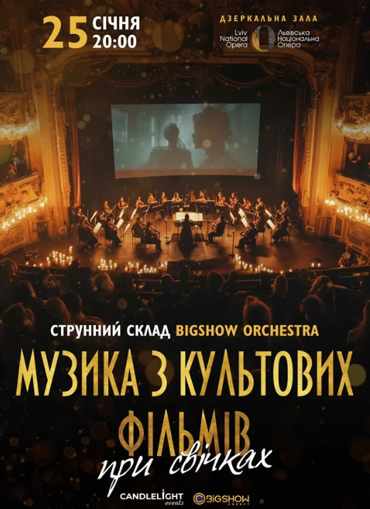 Подія, яка об'єднає музику, світло та магію кіно. Струнний оркестр BigShow перенесе вас у світ саундтреків з легендарних фільмів, які залишили слід у серцях мільйонів.