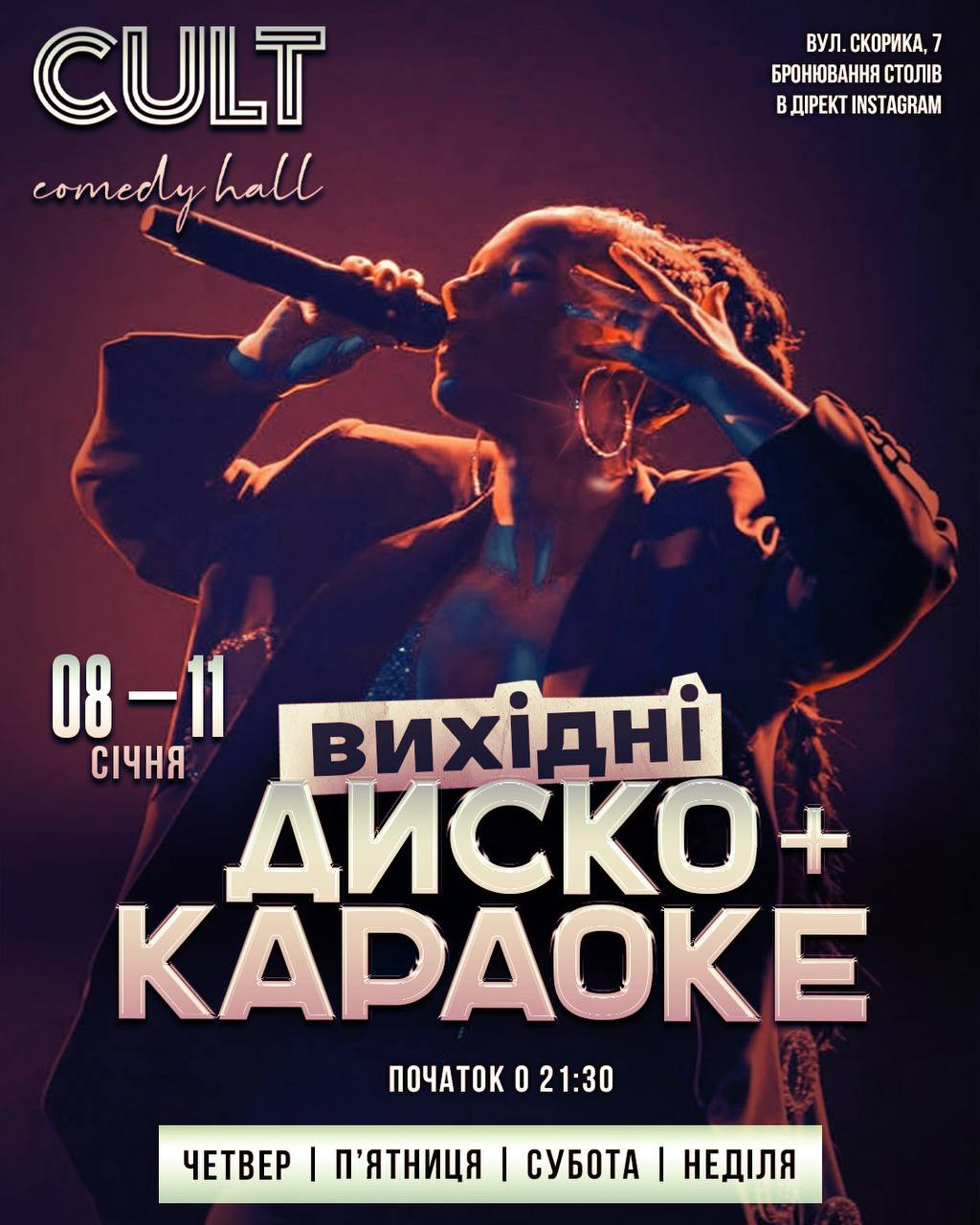 Наш DJ міксує улюблені хіти, додає авторські звучання та створює вайб, який точно зможе запалити танцпол. Чекайте на живі сети, неочікувані треклисти та атмосферу, яку можна знайти тільки у Cult Comedy Hall.