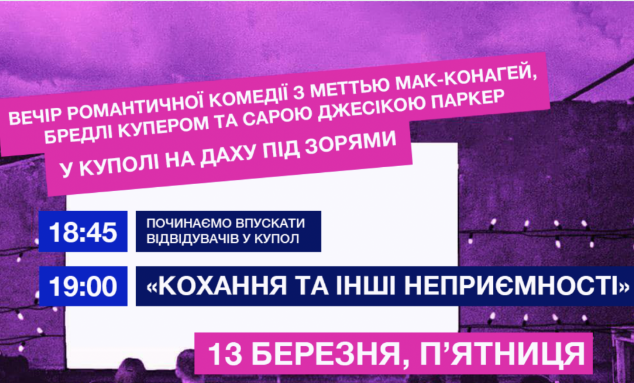 Вечори культового кіно у куполі на даху під зорями! У нас атмосферно, тепло, затишно і на випадок вимкнення світла — є сонячні батареї та генератори! Тому запрошуємо в гості на особливий вечір у куполі на даху!
