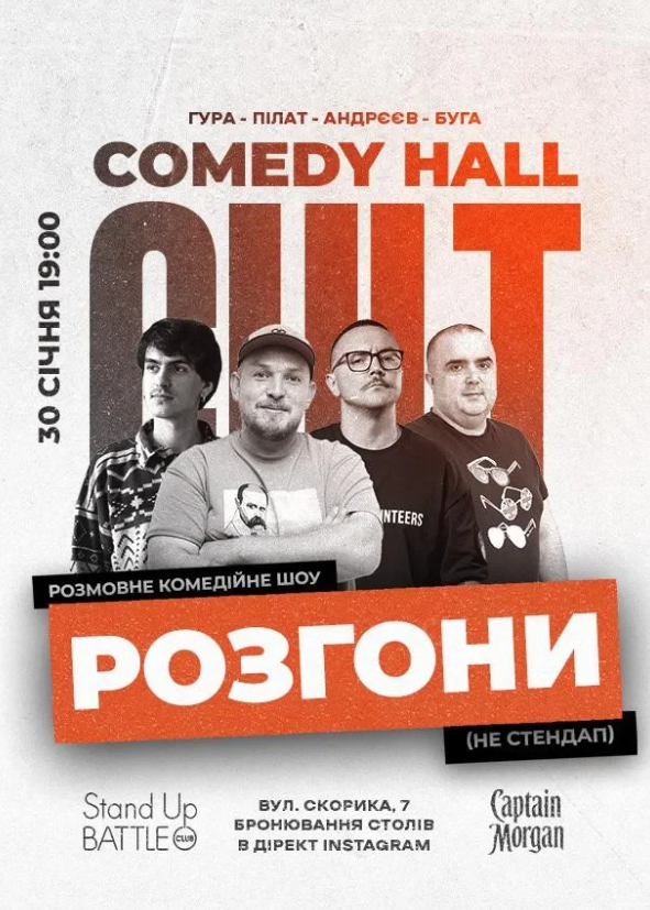 Розгони – це комедійно-імпровізаційне шоу, в якому коміки у форматі живої розмови доповнюють жарти один одного, ще й спілкуючись з глядачами.