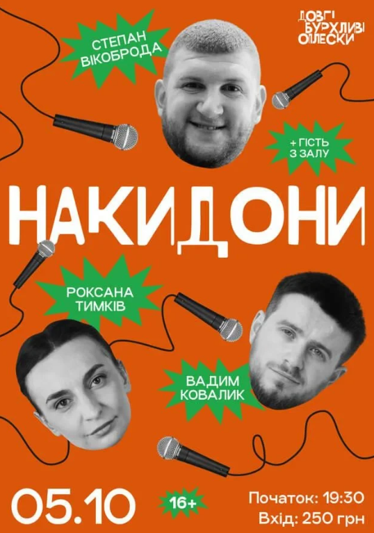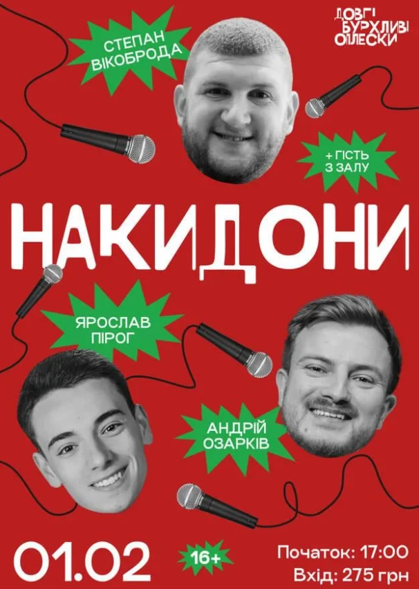 Шоу "Накидони" - імпровізаційний формат, в якому коміки знайомляться з глядачами, обговорюють новини і роблять свої заготовки смішнішими! Глядачі можуть пропонувати свої новини і весело проводити вечір в теплій атмосфері!