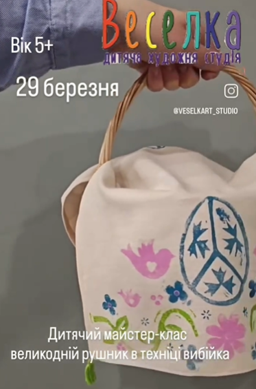 Запрошуємо на майстер-клас з оздоблення рушничка у техніці вибійка акриловими фарбами. Натуральна тканина льон. Колір орнаменту вибір дитини в асортименті.