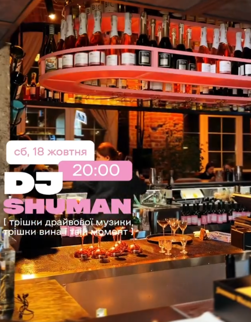 Запрошуємо Вас на вечір живої музики разом з DJ Shuman. Продовжуємо зігрівати живою музикою ці романтичні осінні вечори. Нехай весь світ танцює з тобою в один біт цього вечора. Лише ти, музика та твої особливі моменти.