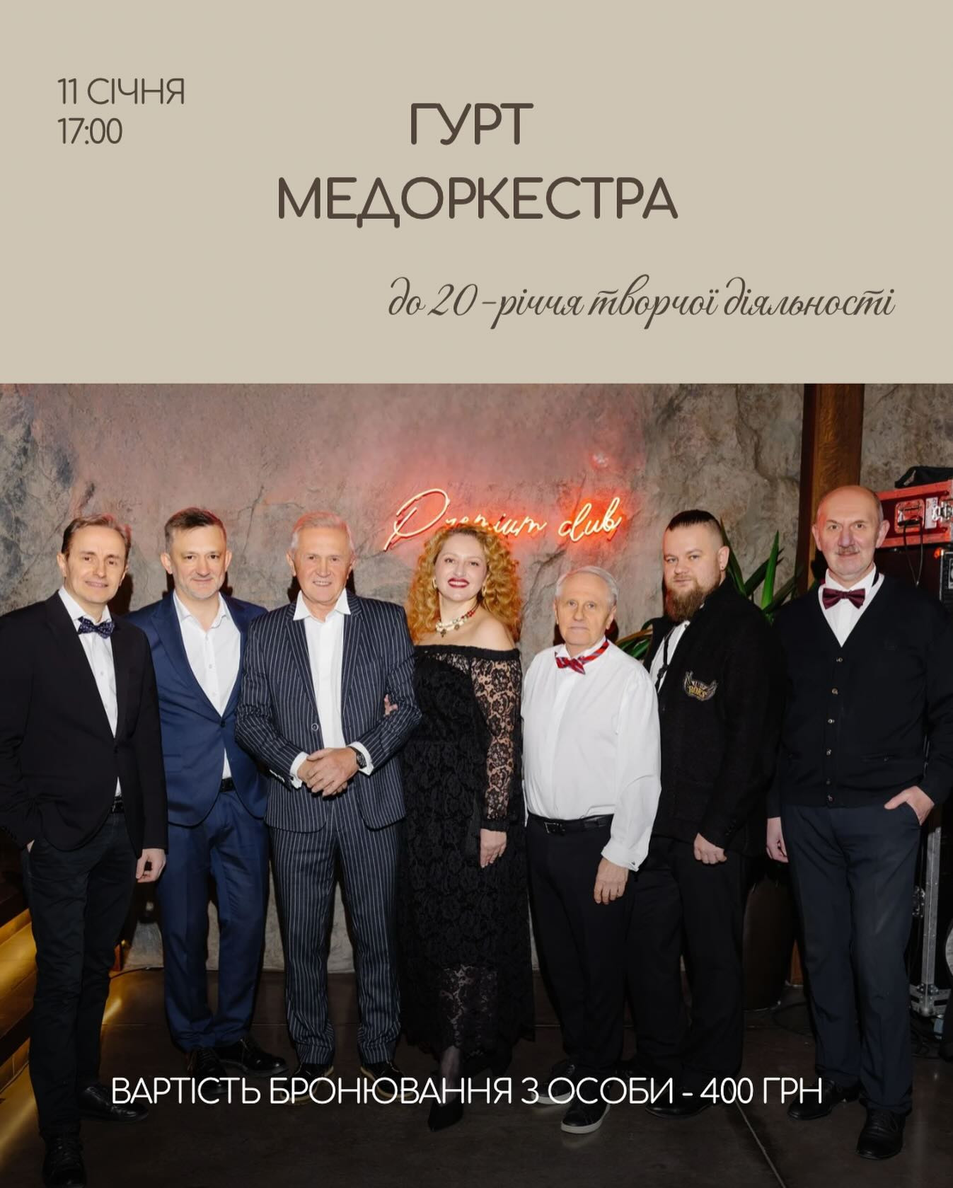 Ресторан Грушевський та гурт МедОркестра запрошують вас на музичний вечір з нагоди 20-річчя творчої діяльності гурту.
