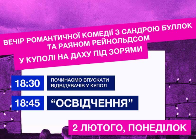 Будемо дивитися романтичну комедію "Освідчення" з Сандрою Буллок та Раяном Рейнольдсом у головних ролях! Адже люди ми тільки тоді, коли дуже сильно любимо! Запрошуйте коханих, друзів, близьких, беріть щось смачненьке з собою і гайда до нас на дах.
